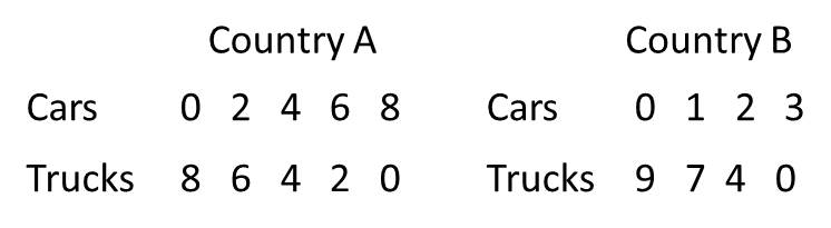 2. Using the correct answer in question 1, if Country B traded away 6 trucks, how many cars would it receive from Country A?